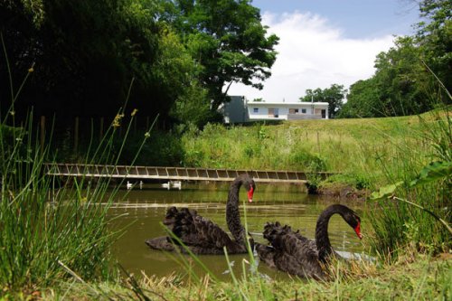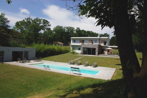 L’edificio grande 300 m² si trova su un terreno per metà ricoperto da alberi, grande 6.250 m². Al primo piano si trovano 3 camere da letto, tra cui la camera da letto per i genitori con un grandissimo spogliatoio che conduce in un bagno con vasca e doccia all‘italiana. Da qui si arriva a una camera da letto con camino aperto e posti a sedere integrati. Altre due camere da letto sono collegate a un bagno in comune con doccia all‘italiana. L’intero edificio dispone di accesso diretto alla grande terrazza e al balcone. Toilette indipendenti si trovano nel corridoio di collegamento. Al piano terra si trova un salone con tv, video proiettore con panorama screen e sistema audio Bose. Questo spazio può anche essere usato per dormire. Qui si trova anche la cucina aperta nuovamente e completamente arredata, con un‘isola centrale adiacente per 4 persone. C’è inoltre una camera da pranzo con un tavolo per otto persone. Dalla cucina attraverso una porta a vetri scorrevole si arriva direttamente sulla terrazza con la grande pergola e salendo ancora una scala giapponese si arriva a una pista di birilli. Attraverso un piccolo corridoio si raggiunge una libreria, una grande toilette e il lavatoio con porte di vetro verso l’esterno. Ulteriori vie giapponesi collegano le terrazze e la superficie della piscina. Nella pool house ci sono uno spogliatoio, una toilette indipendente, una cucina/bar e una grande camera per gli ospiti con una grande porta doppia a vetri, bagno e toilette. Da qui c’è un’incantevole veduta oltre la piscina sulla natura circostante. La casa offre tutte le comodità moderne come aria condizionata, internet, sistema audio, ecc.