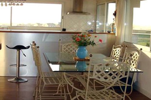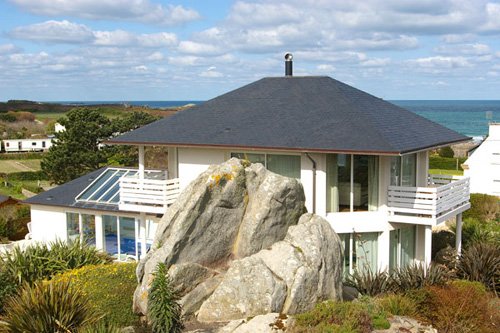Une villa très lumineuse, ouverte sur la mer et sur la campagne léonarde à perte de vue. Au rez de chaussée, la pièce de vie, vitrée sur toute sa longueur, offre un salon, une cuisine ouverte toute équipée et un espace salle à manger. Un second salon se trouve en mezzanine et bénéficie d’une vue extraordinaire sur l’île de Sieck et la plage du Dossen. Un balcon coté Est pour le petit déjeuner et un autre côté ouest pour apprécier les superbes couchers de soleil. Les 3 chambres qu’offrent cette villa disposent toutes d’une vue mer. Une chambre double avec sa salle de bain privée, et deux autres chambres dont une ayant un accès à la salle de bain du Spa; salle de bain avec baignoire balnéo et vue sur la piscine. Piscine intérieure privée chauffée à 29 / 30° (+ ou – suivant votre souhait).