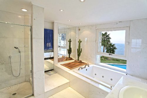 Entrée avec dressings invités, salon avec espace salle manger, donnant sur la terrasse. Les grandes baies vitrées offre un maximum de lumière et de clarté. Salle de télévision indépendant. Cuisine indépendante complète avec un accès sur une terrasse où est installée une salle à manger d’été. A ce niveau, une chambre double avec salle de bains privative et accès indépendant. Au premier étage: 1 chambre double (140 cm) avec en mezzanine un autre lit double (140 cm) et une salle de douche attenante avec dressing. La chambre de maître située à cette étage dispose d’une salle de bains & douche privative avec dressing et une terrasse privée. Toutes les chambres bénéficient d’une terrasse ou d’un balcon avec une vue panoramique sur la mer. En rez de jardin, un appartement indépendant composé d’un salon avec un canapé lit (140 cm), une salle de douche et une chambre double donnant sur une grande terrasse avec vue mer. La décoration est soignée dans toute les pièces et toutes offrent un panorama idyllique sur la baie. Lignes intérieures contemporaines. Toutes les pièces s’ouvrent largement sur l’extérieur avec une vue à 180° sur la Méditerranée et le Golf.