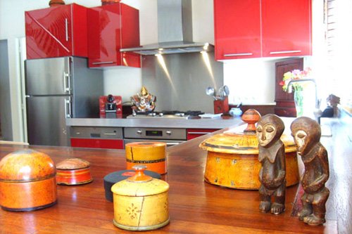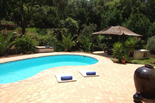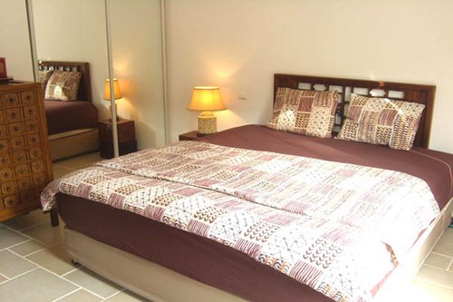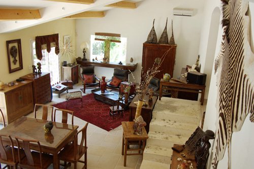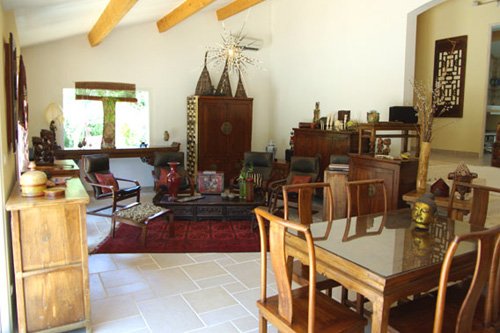 Vom Entrée gelangt man direkt in einen großen Salon mit Essbereich und komplett ausgestatteter amerikanischer Küche. Die asiatisch inspirierte Einrichtung ist sehr angenehm, die weit zu öffnende Glasfront stellt die Verbindung zu Terrasse und Pool her. Im oberen Stock befindet sich ein Salon mit TV und Multimediabüro, sowie nach Vereinbarung die Möglichkeit eines zusätzlichen Gästezimmers. Das Haupt-Schlafzimmer mit privatem Badezimmer befindet sich im Erdgeschoss. Zwei Doppelzimmer mit gemeinsamem Badezimmer liegen im Zwischengeschoss. Die bewohnbare Fläche ist 165 m². Der Garten ist zur Gänze umfriedet, es gibt kein gegenüber. Er öffnet sich zu einem kleinen grünen Hügel, der direkt hinter der Bucht und den zu Fuß erreichbaren Stränden liegt. Nahe der Terrasse liegt ein balinesischer Pavillon mit Barbecue.