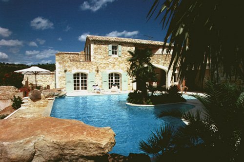 This elegant farmhouse is very unique. It has a medieval flair yet is also very typically Provençal, imbued with attractiveness and style. The villa has been built using only old materials, but the interior decoration is contemporary. The organic shape of the swimming pool has won several architecture prizes. Both the interior and exterior spaces and décor are very well thought out, with the stone materials, water, and lush vegetation harmonizing splendidly. The property’s position provides a very nice panorama of the countryside and the medieval town of Uzès, with part of the Cèvennes mountain range as a backdrop.